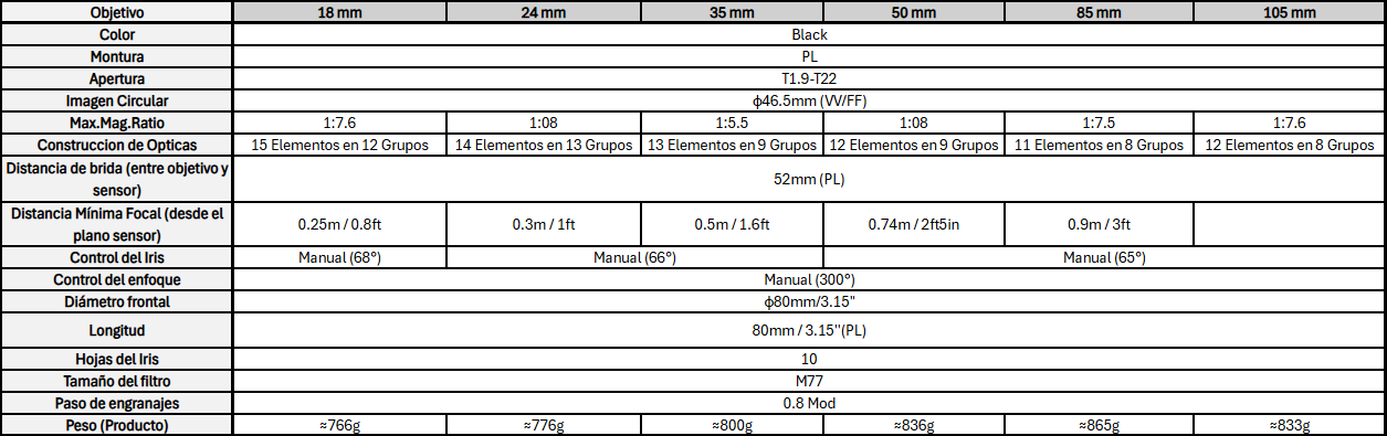 <li>Full Frame/VV | Apertura de T1.9 a T22</li>