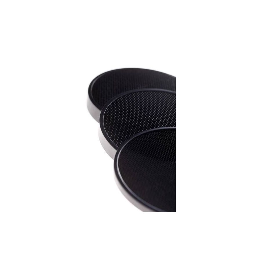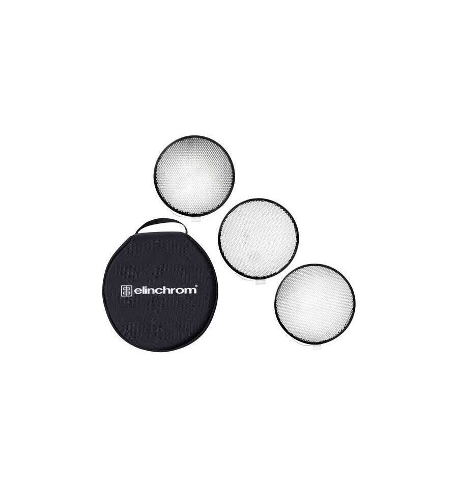 El kit de rejilla Elinchrom incluye rejillas de 30°, 20° y 12°. Las rejillas son compatibles con el reflector Elinchrom de 8,25". Los diferentes ángulos le permiten controlar qué tan apretado es el haz de luz. Cuanto más pequeño sea el ángulo, más enfocado estará el haz. Las rejillas son negras para evitar que la luz rebote en el lados También se incluye una bolsa de transporte para almacenar, transportar y proteger hasta cuatro rejillas.