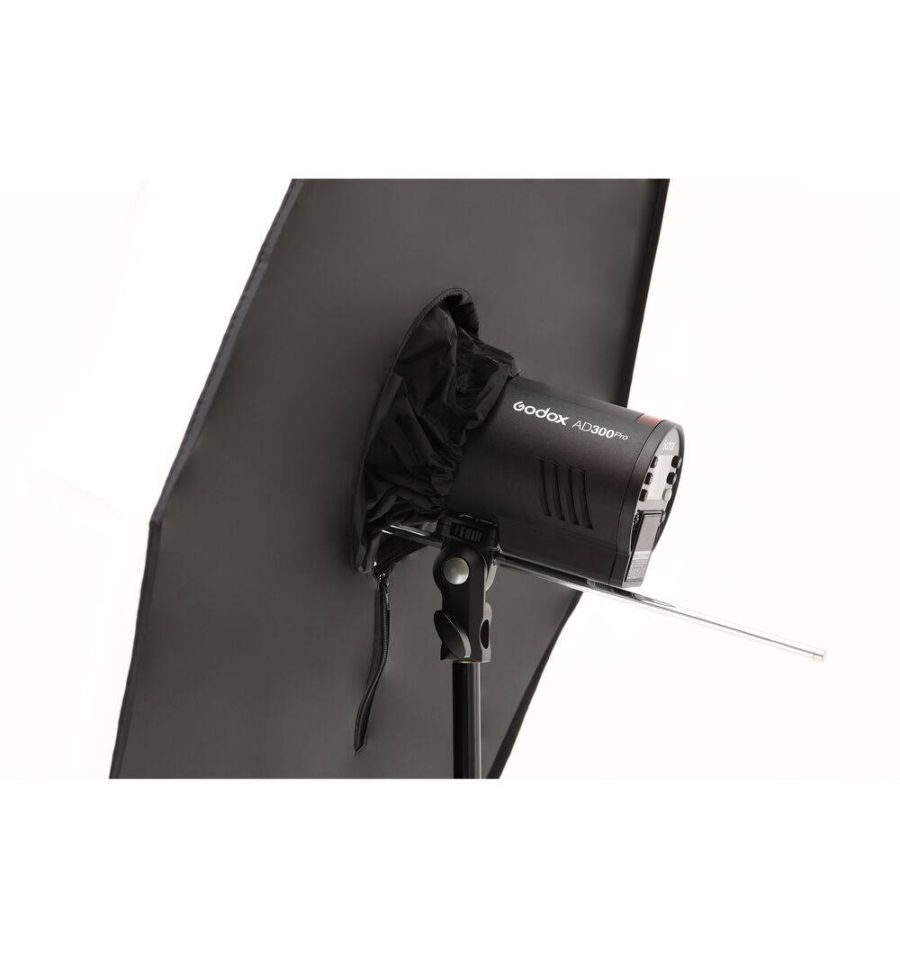 El paraguas transparente de 33,5" para el cabezal de flash AD300Pro de Godox es un modificador que difunde la luz sobre una amplia área del sujeto. A diferencia de los paraguas estándar con respaldo negro, este paraguas es translúcido y permite que la luz escape por la parte posterior (lado convexo) y aumentar el nivel de luz ambiental. Una característica única de la sombrilla (que es excelente para techos bajos) es la opción de girarla para "disparar a través de ella" apuntando la parte exterior curva de la sombrilla hacia el sujeto para obtener una calidad de imagen ligeramente más nítida. luz.