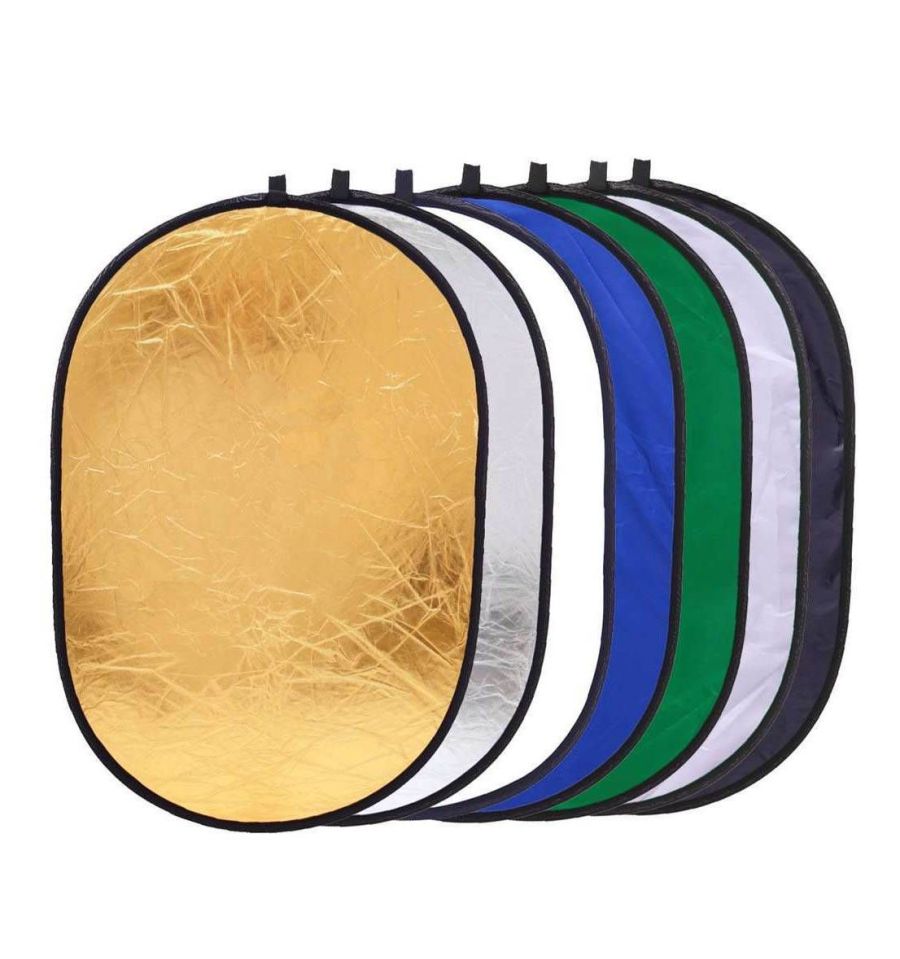 Reflector de 150×200 cm plegable Godox 7 en 1 opciones. Se usa para rellenar sombras a fotos rostros y retratos de medio cuerpo. Dispone de 7 colores: Negro, blanco, dorado, plateado, azul,verde cromakey y en el centro blanco traslúcido difusor. Puedes utilizarlo con el brazo extensión y soporte para reflector. Te lo enviamos en 24 hrs
