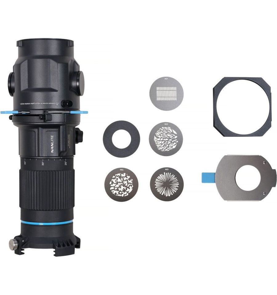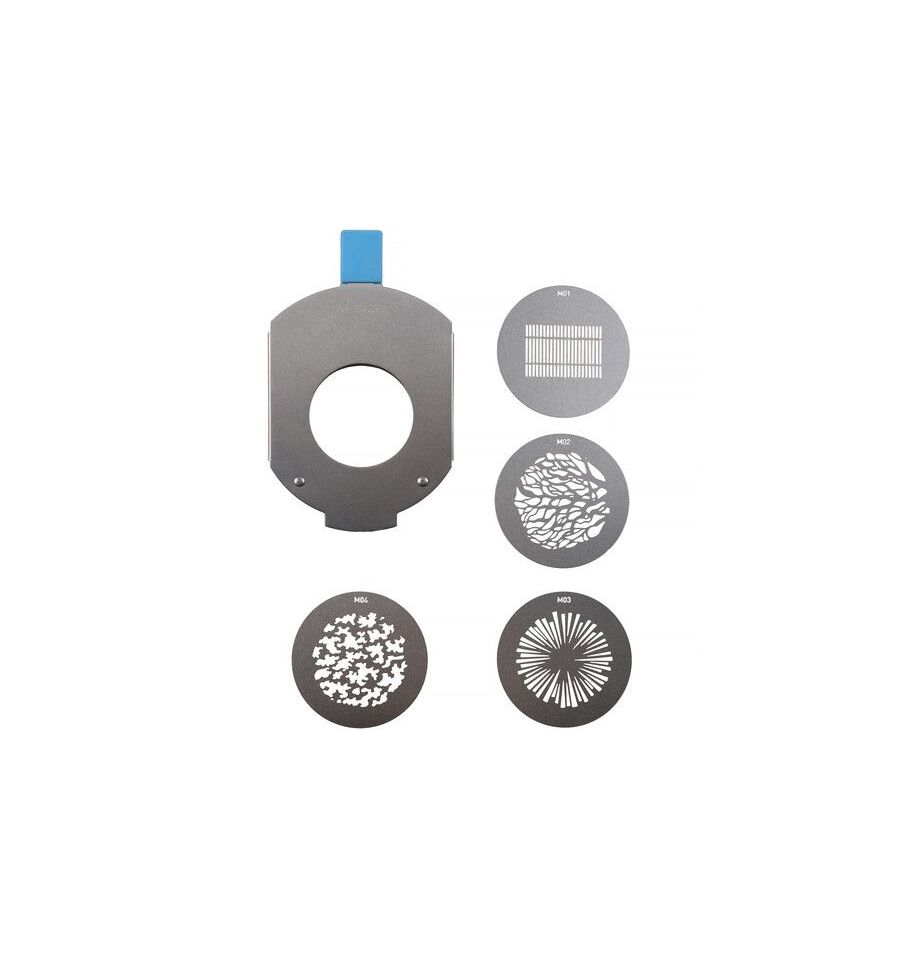 Consigue una variedad de patrones que añaden creatividad a tus tomas con proyecciones nítidas. Se incluyen cuatro gobos, un soporte para gobos y un marco de gel para ampliar sus posibilidades. También se suministra una hoja de apertura magnética para mejorar la calidad del haz y reducir la luz parásita. Nanlite también ofrece un iris opcional de 18 hojas para controlar aún más el diámetro del haz.