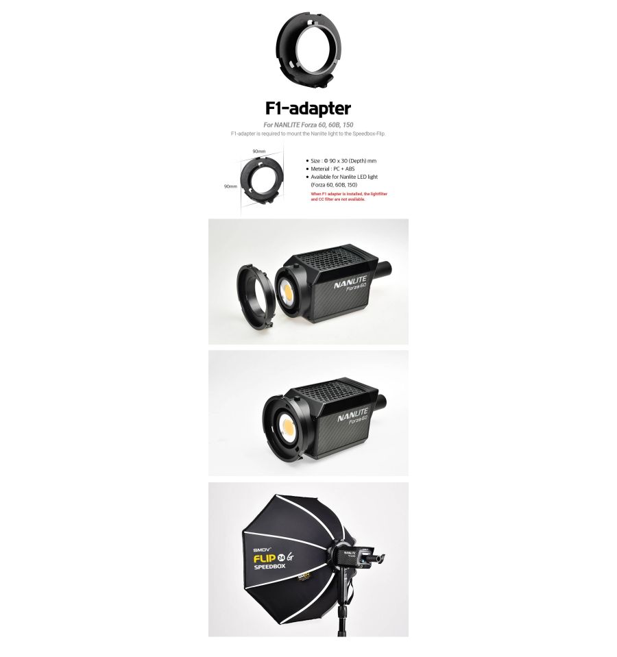 - Compatible con Nanlite Forza 60 60B y 150 flashes ¡Simplemente conecta el adaptador a tu speedbox y listo!