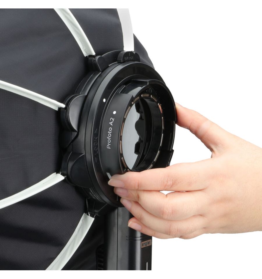 - El adaptador FB-PA2 se bloquea en FastBox con un simple giro y agrega un soporte seguro para el monolight Profoto A2. Le permite utilizar el flash como una unidad independiente mientras se beneficia de las capacidades de modificación y modelado de la luz del Angler FastBox.