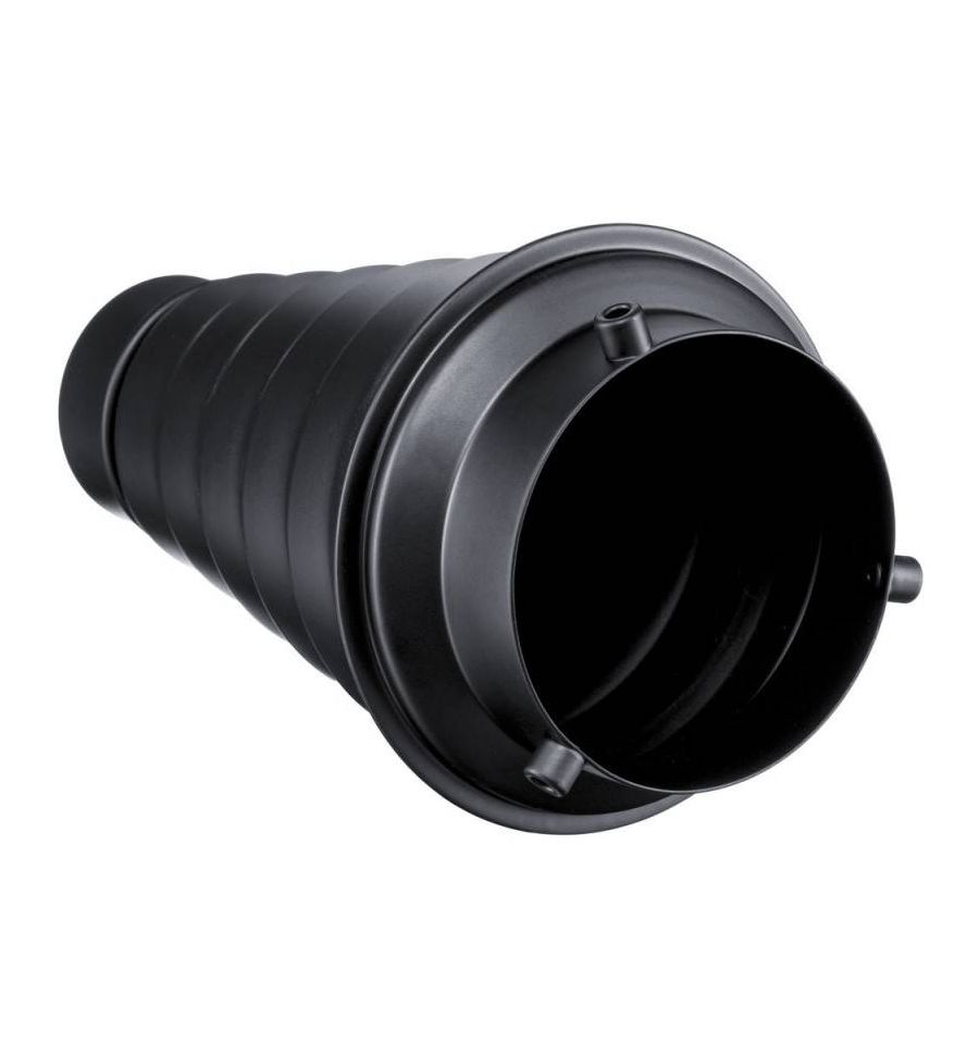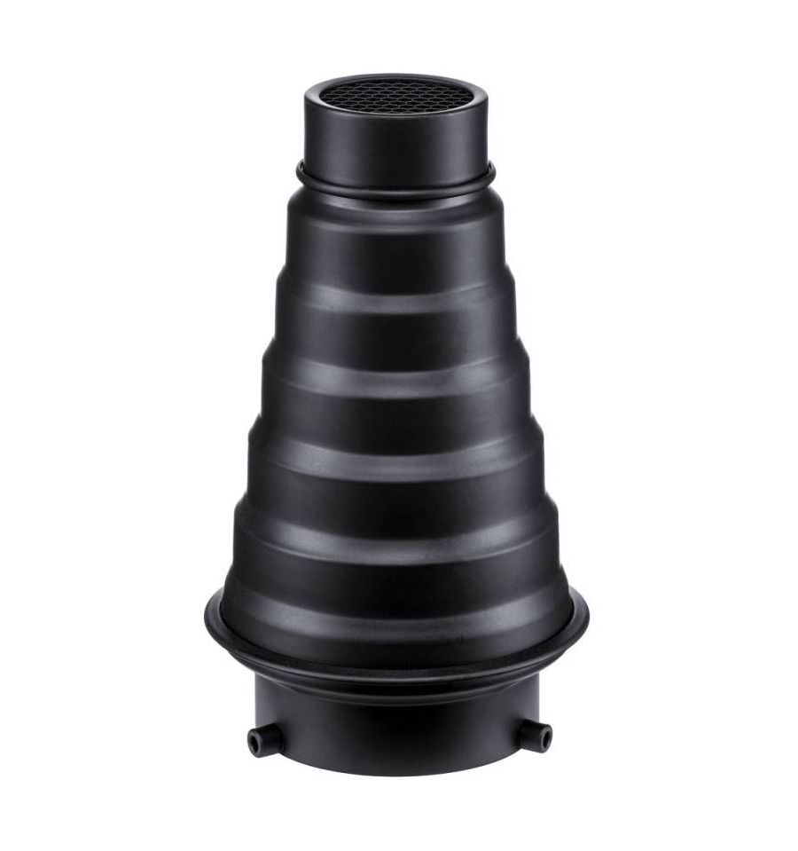 Un modificador que permite un enfoque estrecho de luz sobre un objeto. Snoot tiene un nido de abeja (permanentemente unido) al final. Obtén un control más preciso de dónde cae la luz en el escenario usando Snoot con su malla de nido de abeja. Snoot es compatible con flash y luz continua con montura Bowens.