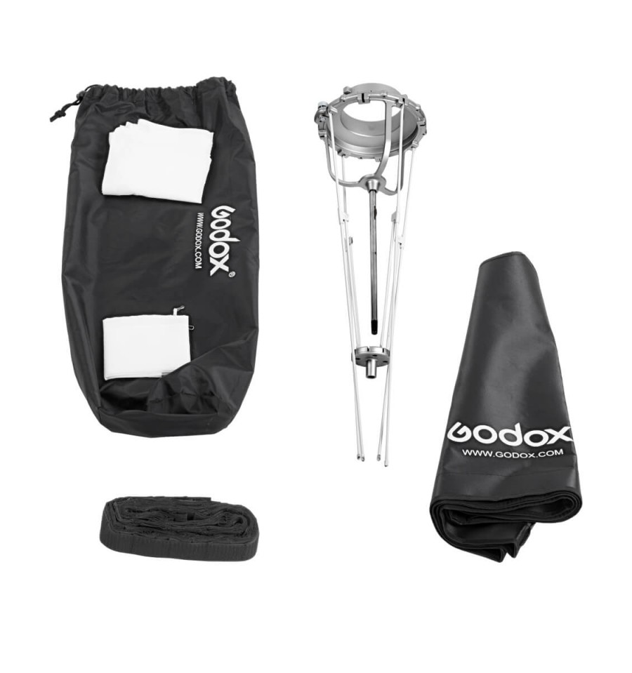 La serie Softbox GODOX SB-GUE no solo ahorra un tiempo valioso, sino que también facilita el trabajo en el set. Esto es posible gracias al marco que utiliza el principio de paraguas. El material del revestimiento se estira y mantiene tenso mediante una estructura cuyas barras están hechas de acero elástico. Si es necesario, softbox se puede plegar y ocultar en la funda en unos segundos. Softbox OCTO Godox rápida de 120 cm con montura Bowens, panal y bolsa de transporte. La ventana dispone de un anillo central que permite abrir cómodamente las varillas. Se pliega rápidamente ,como si fuera un paraguas, en pocos segundos.