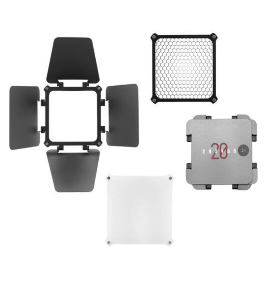 El Kit de Accesorios para la serie M20 de Zhiyun proporciona los accesorios esenciales para modificar y controlar la luz de los modelos M20/M20C. Incluye un difusor para suavizar la iluminación, unas aletas (“barndoors”) de 4 hojas para controlar los derrames de luz y una rejilla tipo panal (honeycomb) para dirigir el haz, creando una luz suave pero más enfocada. También se incluye una bolsa para almacenamiento y transporte.