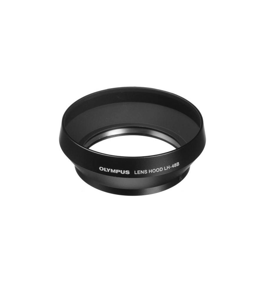 El parasol negro LH-48B para lente M.Zuiko Digital 17mm f/1.8 de Olympus es un parasol de metal diseñado específicamente para el lente de 17mm f/1.8 mencionado anteriormente. El propósito principal de un parasol de lente es desviar la luz no deseada para que no entre en la lente y produzca destellos.