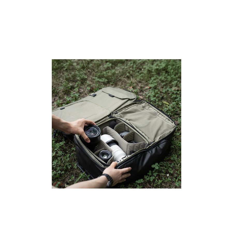 Versión de 35L en color verde oliva, diseñada para fotógrafos en movimiento. Ofrece almacenamiento para cámaras, lentes y accesorios, con un diseño funcional y resistente al agua. Ideal para viajes y actividades al aire libre. Dimensiones: 500 x 330 x 250 mm