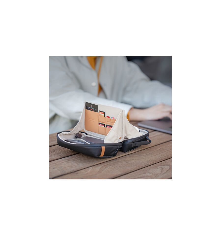 El Mini Organizador Tecnológico negro crepuscular de PGYTECH sostiene y organiza tus pequeños accesorios. Cuenta con una abertura tipo concha para que puedas usarlo medio cerrado o completamente abierto. Múltiples bolsillos interiores y trabillas elásticas para accesorios sostienen sus cargadores, cables, auriculares, bancos de energía, bolígrafos, baterías y más. El exterior es repelente al agua, por lo que es ideal para viajar. Un bolsillo oculto para el AirTag brinda tranquilidad durante sus desplazamientos.