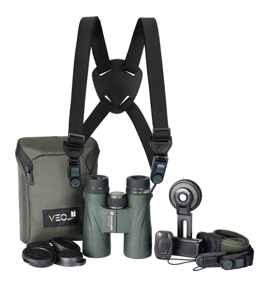 El kit de prismáticos VEO ED 8420 incluye el binocular Veo de 8 aumentos y objetivo de 42mm con óptica ED de dispersión extra baja. Este kit incluye el adaptador para digiscoping VEO PA-62 con mando bluetooth para tomar fotos y vídeos con el teléfono móvil. También, incluye un cómodo arnés, una correa para el cuello, una bolsa de transporte y pañuelo de limpieza.