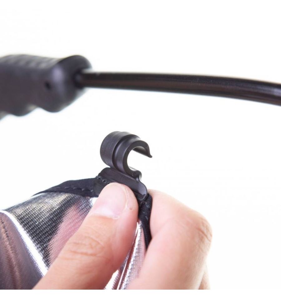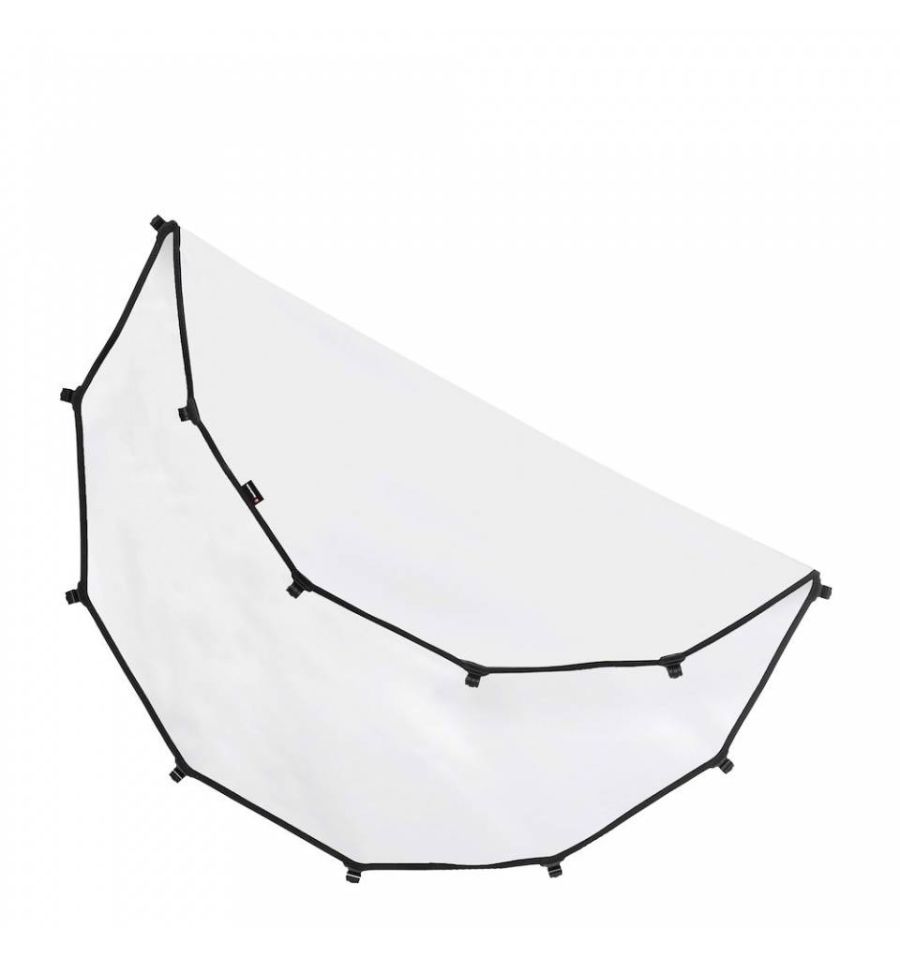 Tiene un bastidor ligero plegable de aluminio que se repliega rápidamente en sus ranuras, y la cubierta de tela del reflector se abrocha directamente sobre el bastidor. Este diseño RapidExoFrame permite que el bastidor se desmonte en varias secciones pequeñas; junto con la cubierta de tela plegada, pueda transportarse en un estuche que solo mide 6,5 x 27 x 6,5 cm (2.5” x 10.5” x 2.5”) y que pesa 335 g (reflector y estuche).