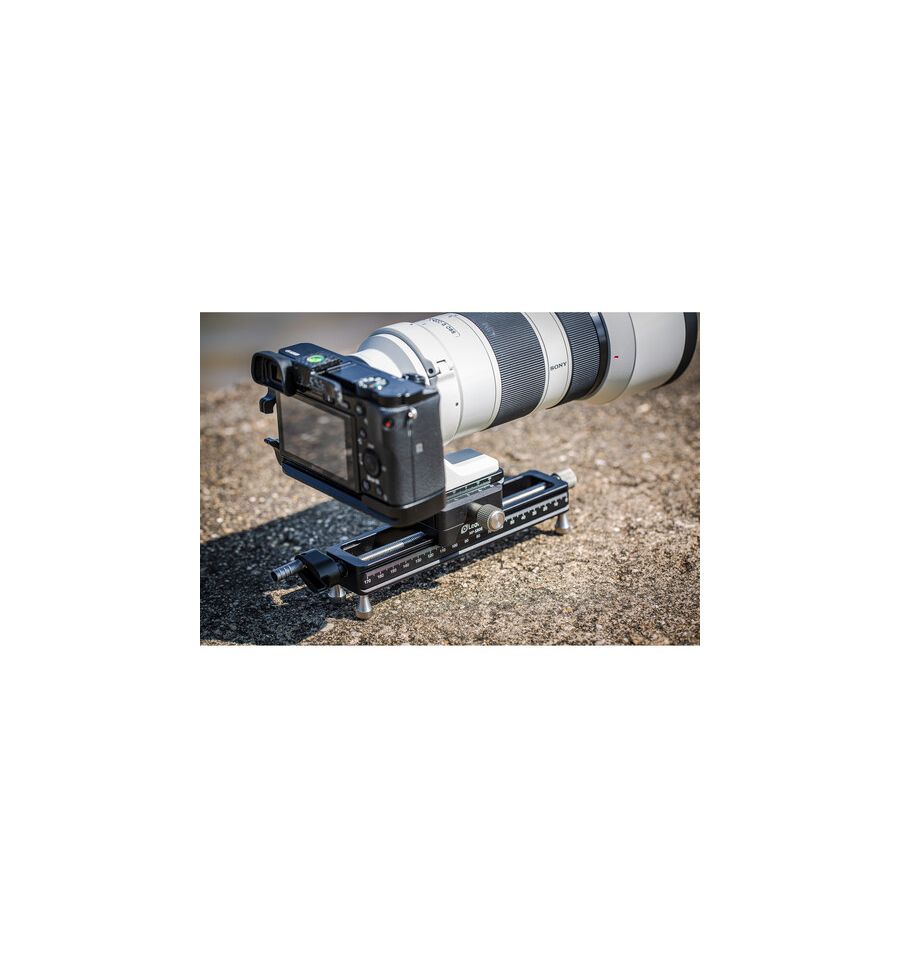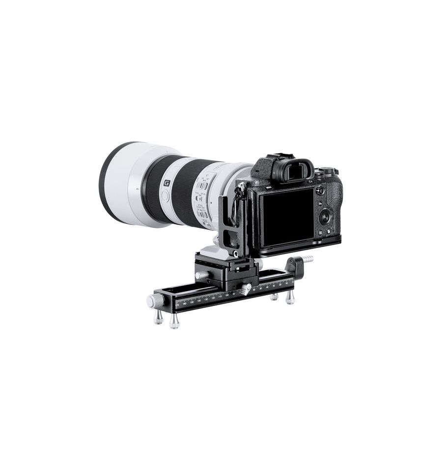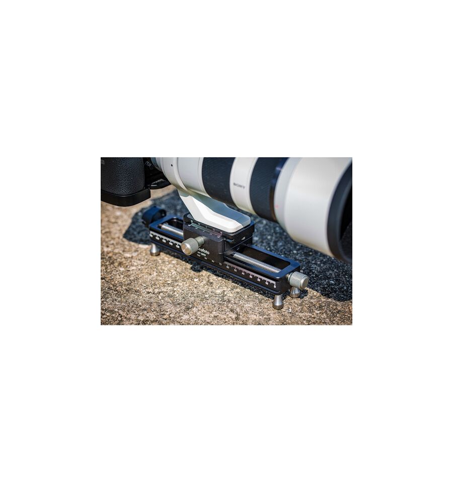 El raíl de enfoque macro MP-180S de 7,1" de Leofoto es una platina y un raíl de enfoque de husillo de movimiento lineal de precisión, que incorpora una plataforma de cámara con un conjunto de liberación rápida giratorio tipo Arca. El riel tiene una capacidad de 6,7" de distancia de recorrido, cada rotación completa de la manivela proporciona 1,25 mm de movimiento para un posicionamiento preciso de la cámara. La perilla de enfoque tiene una manivela que se pliega convenientemente. El riel tiene un diseño ahuecado para reducir el peso, pero aún mantiene una robusta capacidad de carga de 17.6 lb. La base del riel cuenta con una cola de milano tipo Arca, lo que facilita su montaje en dispositivos compatibles. También tiene cuatro pies extraíbles con punta de goma para uso en la mesa.