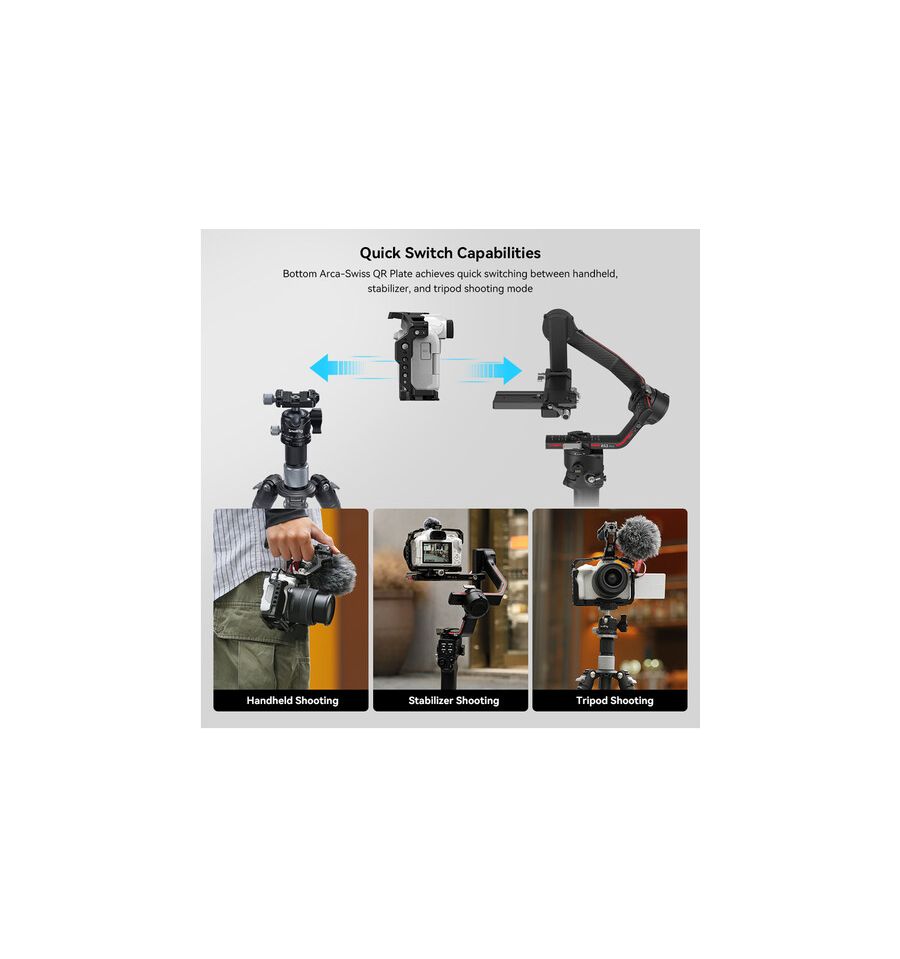 (Cada 10,00 € gastado = 1 punto, 1 punto = 0,10 € de descuento).Amplía tus opciones de montaje y protege tu EOS R50 de Canon con esta Jaula de cámara completa de SmallRig. Múltiples roscas de 1/4"-20 y 3/8"-16 en toda la jaula ofrecen puntos de montaje para brazos articulados, abrazaderas de cable y otros accesorios. Un soporte de zapata fría en la parte superior de la jaula puede acomodar un monitor en la cámara o luz de relleno. Un riel NATO en el lado izquierdo de la jaula le permite integrar una abrazadera de cable. Cuando se conecta a la cámara, la placa QR Arca-Swiss de la jaula puede hacer fácilmente la transición de su equipo de mano a montaje en trípode o cardán. Incluso puede colocar una hebilla de correa para el hombro usando el zócalo QD integrado.