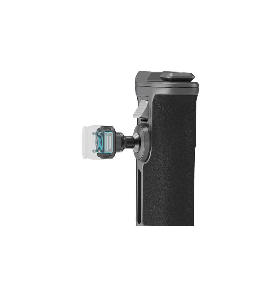 La parte superior del mango cuenta con un receptor de zapata fría para un micrófono, luz LED u otro accesorio compatible. También hay un pequeño riel HawkLock en la parte superior para accesorios de abrazadera adicionales. Dos ranuras para correas proporcionan soportes sólidos para una correa de mano opcional. El mango de aluminio cuenta con un agarre antideslizante y gira 360° para obtener el mejor ángulo.