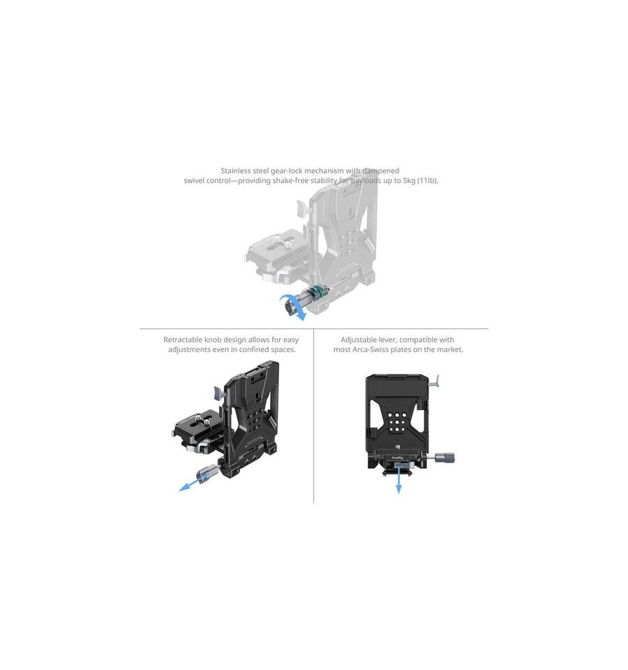 - Las múltiples roscas de 1/4"-20 y 3/8"-16 le permiten integrar accesorios adicionales como abrazaderas de cable, placas base, brazos articulados u otras placas de montaje.