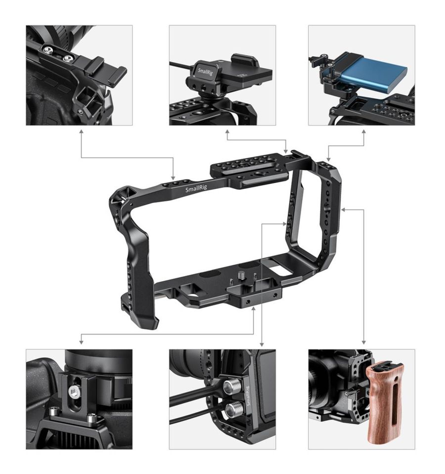SmallRig Full Cage para Blackmagic Design Pocket Cinema Camera 4K y 6K 2203B es una jaula que se ajusta a la forma. Está bloqueado de forma segura a la cámara con tornillos de 1/4 '' - 20 en la parte superior e inferior, con pasadores de ubicación adicionales y almohadillas de goma en la placa base que evitan que se muevan y se rayen. En la parte superior e izquierda de la jaula hay rieles NATO incorporados, donde puede colocar el mango superior SmallRig NATO 1955 o el mango lateral NATO 2187 de madera SmallRig para disparar con la mano. Múltiples orificios roscados de 1/4 '' - 20 y 3/8 '' 16 y orificios de ubicación ARRI están diseñados para conectar accesorios, como el brazo de bola SmallRig 2070 . Para los usuarios que graban videos, un Samsung T5 SSD Mount 2245B sería una buena opción. La jaula es compatible conAbrazadera de cable SmallRig HDMI y USB-C 2246B para fijar los cables. Funciona con SmallRig Metabones Adapter Support 2247 en BMPCC 4K para mantener estable su lente. Además, se proporciona una llave hexagonal incorporada en la placa inferior.