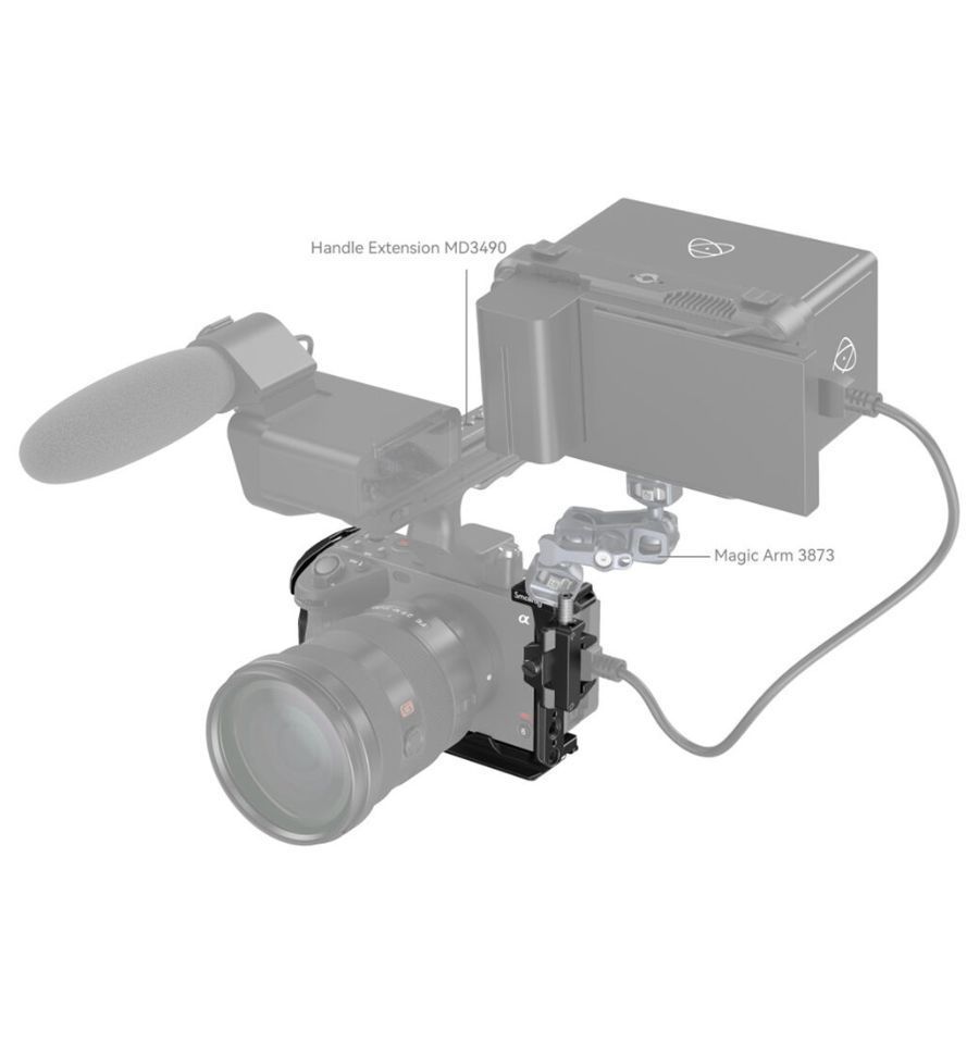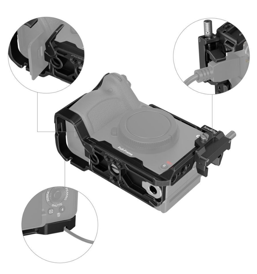 Múltiples roscas de 1/4"-20 y ARRI anti-giro de 3/8"-16 distribuidas por toda la jaula permiten acoplar brazos articulados o incluso montar la cámara en orientación vertical, todo mientras se mantiene el acceso a los botones y puertos de la cámara. Una montura de zapata fría en la jaula permite conectar un monitor externo o un micrófono tipo shotgun. La cámara permanece segura dentro de la jaula gracias a tres tornillos de 1/4"-20. Además, una placa integrada tipo Arca permite deslizar la cámara con jaula sobre un trípode o estabilizador compatible.