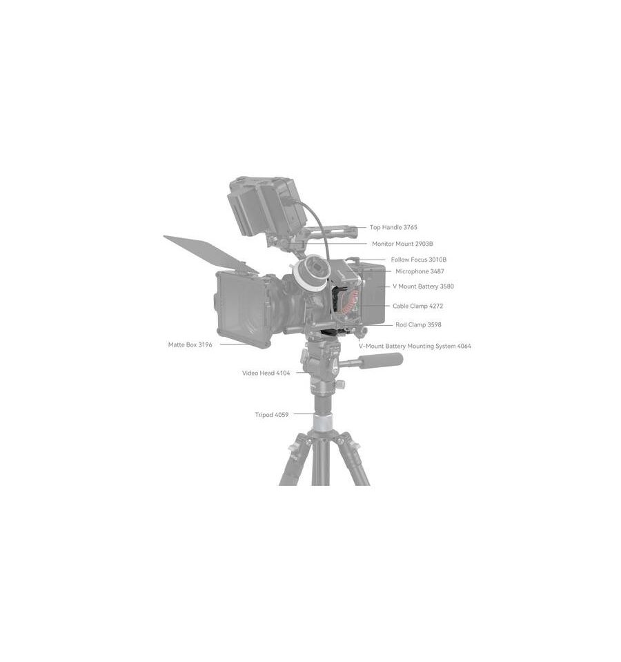La cámara se monta en la jaula usando un tornillo de 1/4"-20, dos adaptadores de bloqueo laterales, acolchado de silicona y un borde frontal para evitar que la cámara se tuerza. Además de múltiples tornillos de 1/4"-20 y 3/8". Con 16 roscas para accesorios, el armazón cuenta con orificios de ubicación estilo ARRI para evitar que los accesorios, como un mango superior opcional o una abrazadera para cable HDMI, se tuerzan cuando se montan en el armazón.