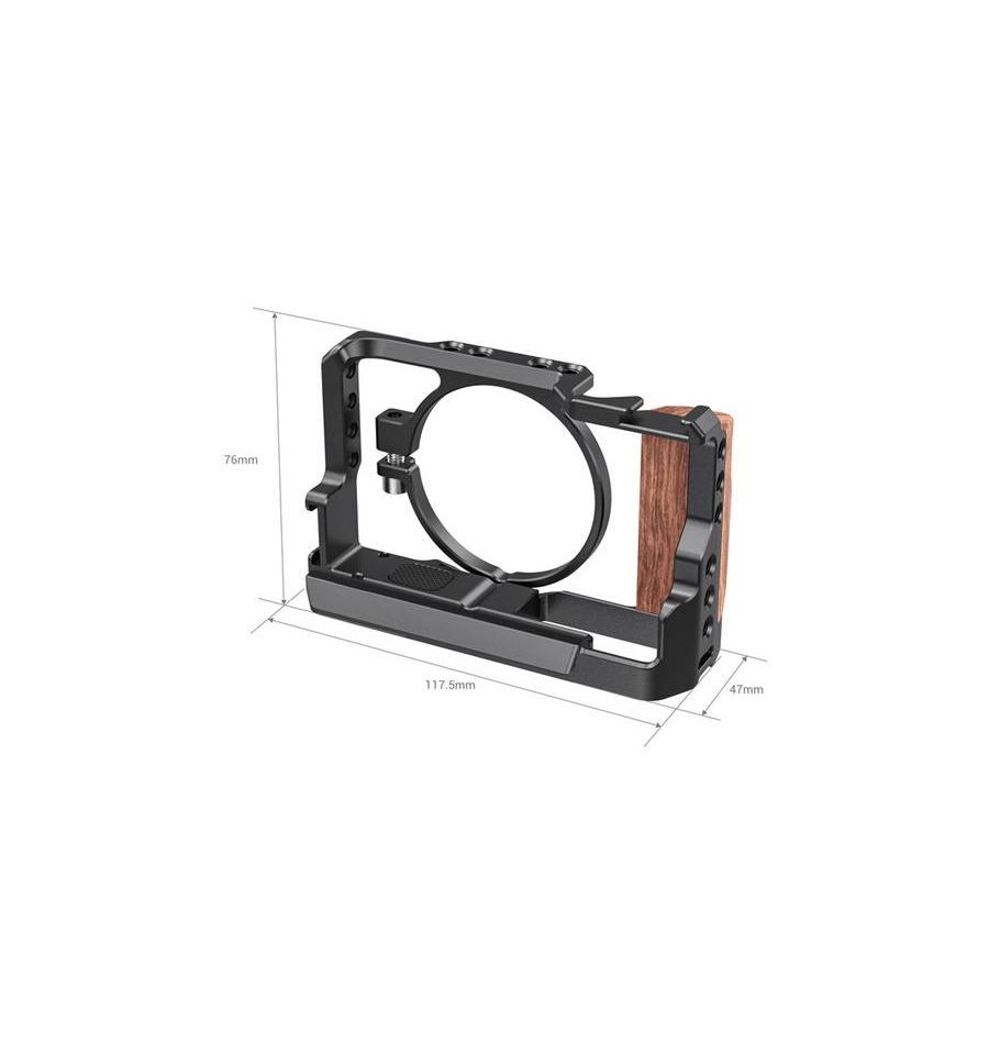 Esta jaula para cámara ajustada de SmallRig protege su cámara Sony RX100 VII o VI sin impedir el acceso a las funciones, pantallas, puertos o batería de su cámara. La cámara se monta en la jaula mediante una abrazadera de anillo de lente frontal que sujeta la cámara de forma segura. Un mango ergonómico de madera en el lado derecho proporciona una superficie de agarre cómoda.