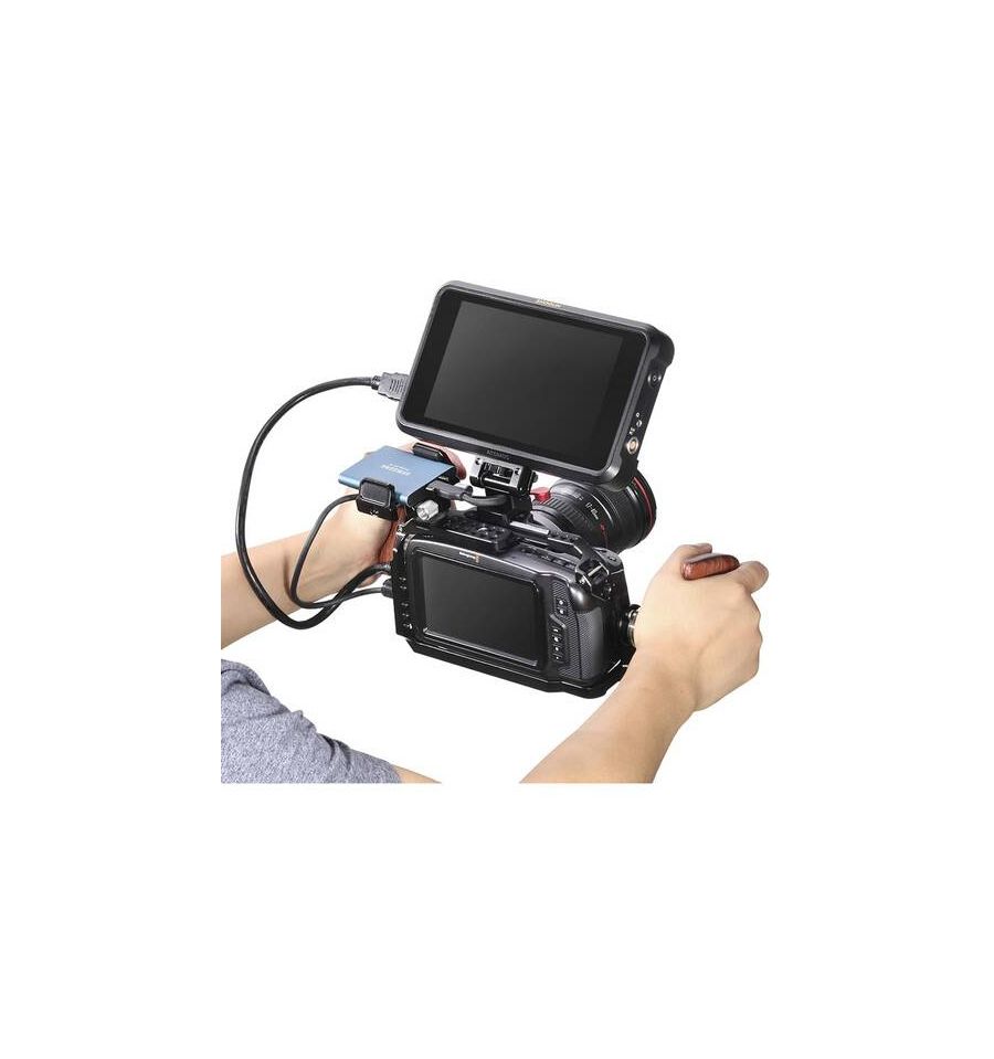 La empuñadura de madera del lado izquierdo con roseta ARRI de SmallRig se monta en la jaula de la cámara o en la roseta estándar ARRI de la plataforma y está contorneada para un agarre cómodo. Esta empuñadura renovada ahora se puede ajustar verticalmente y en tres ángulos con solo dos tornillos y la llave Allen metida en la parte inferior de la empuñadura.