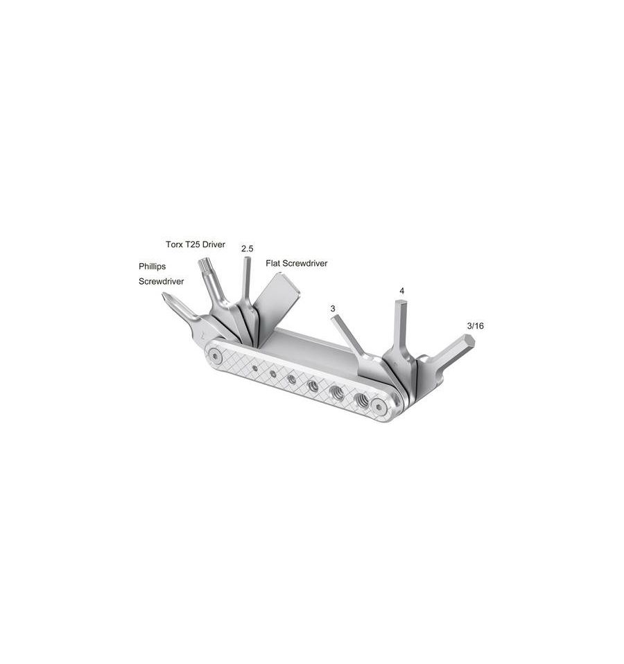 Construida con herramientas de acero inoxidable y una carcasa de aluminio, esta multiherramienta incluye destornilladores de cabeza plana y Phillips, un destornillador Torx T25 y llaves Allen de 2,5, 3, 4 mm y 3/16".