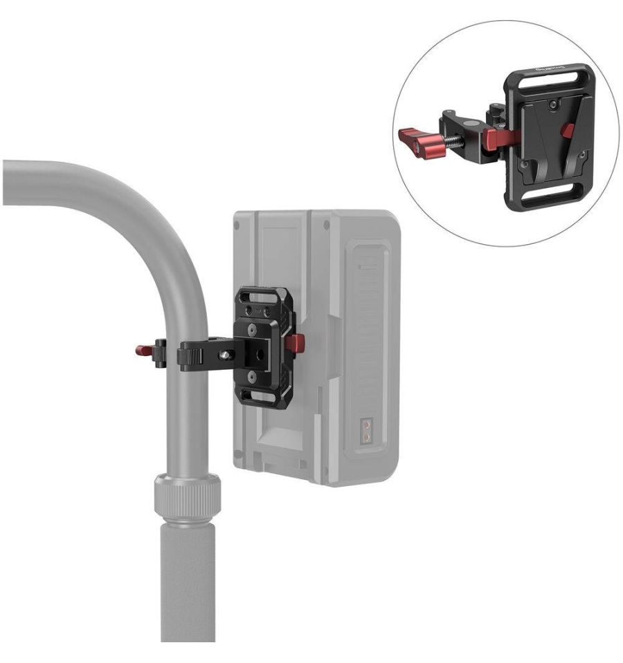 Monte una batería con montura en V en su plataforma con esta placa de batería Mini V-Lock con abrazadera en forma de garra de SmallRig . La montura cuenta con una montura de bloqueo en V con una palanca de liberación rápida que se adapta a la mayoría de las baterías con montura en V y una abrazadera en forma de garra que se monta en una varilla, tubo o superficie que mide de 0,6 a 1,2" de ancho. La montura cuenta con dos 1