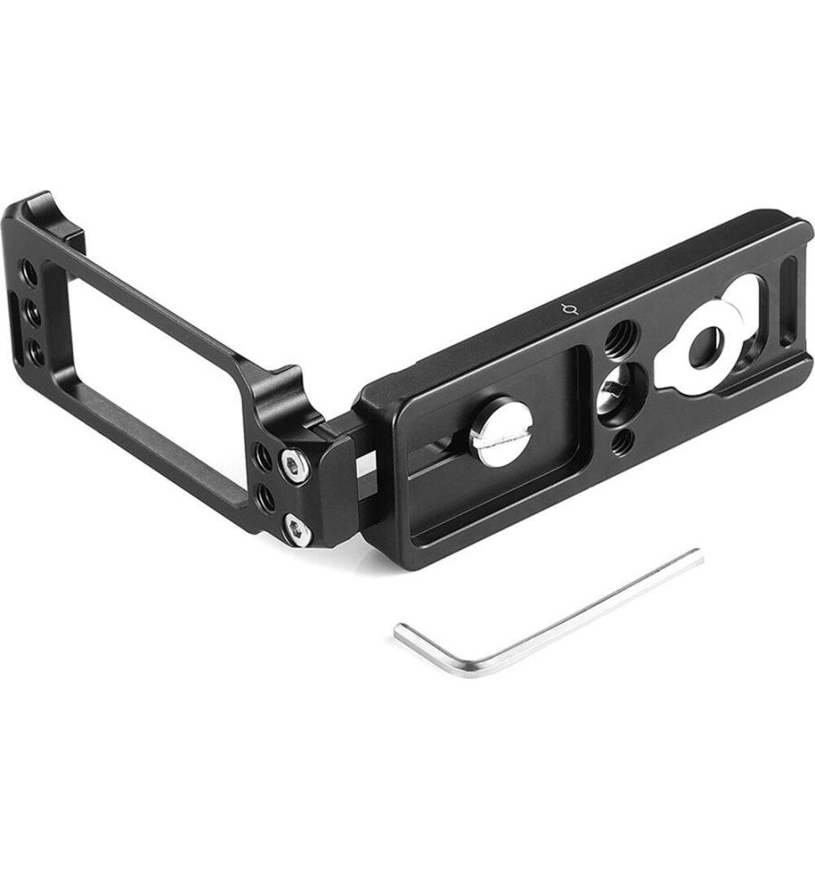 Soporte en L SmallRig para cámara Nikon D-850 2232 es un diseño modular con pestañas anti-torsión para evitar que la cámara se tuerza y proporcionar una toma de mano cómoda. Tanto la placa base como la placa lateral son placas de cola de milano compatibles con el tipo Arca que permiten que la cámara se monte en posición vertical u horizontal. Cuenta con una línea de centrado del sensor en cada eje para alinear la cámara en un cabezal de trípode y mantiene el acceso completo a la batería y los puertos de la cámara. La placa lateral se puede extender hacia la izquierda si se necesita más espacio para la conexión o la liberación del cable. Se usa una llave hexagonal incluida en la parte inferior para apretar y ajustar el soporte en L. Además, es compatible con la correa Peak Design e incluye un lazo de correa de mano en el lado derecho. Además, los orificios de montaje de 1/4 "-20 se encuentran en el costado y la parte inferior para la fijación de accesorios, como el montaje de zapata fría 1593.