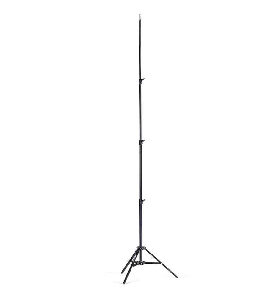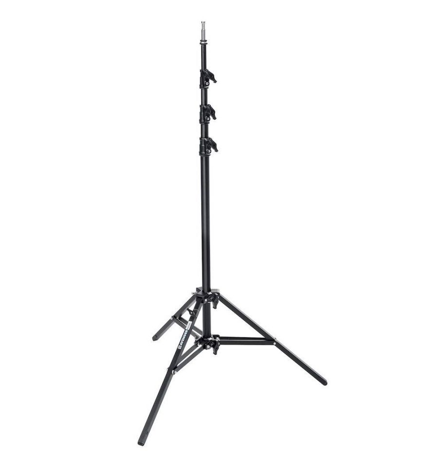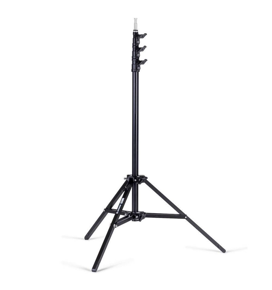 El soporte de iluminación Baby A0035B de aluminio negro con una columna móvil tiene 4 secciones y 3 elevadores. Está clasificado para una carga útil máxima de 9 kg y alcanza una altura máxima de 350 cm.