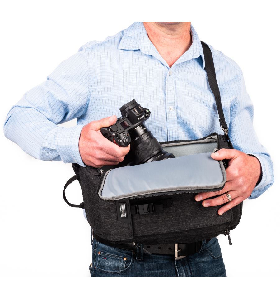 "Basándonos en las innovaciones y el estilo de nuestra mochila Urban Access, estamos encantados de presentar una bolsa bandolera que ofrece acceso completo desde ambos lados", afirma Doug Murdoch, director general y diseñador jefe de thinkTANK photo. La posibilidad de cambiar rápidamente la posición de la correa del hombro para llevarla a la derecha o a la izquierda es un nuevo enfoque que sitúa a esta bandolera en una categoría completamente nueva"."