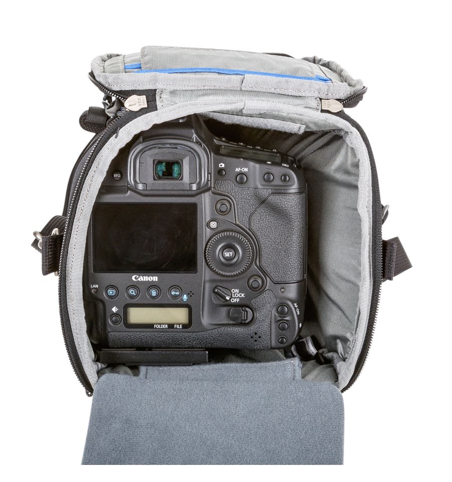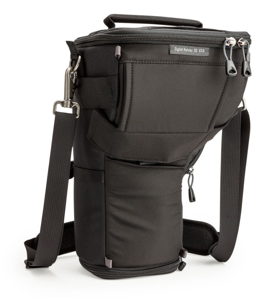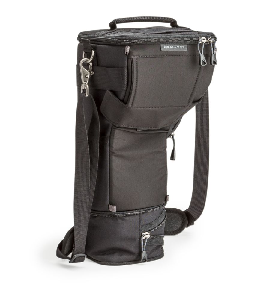 La Digital Holster™ 50 V2.0 está diseñada para cámaras DSLR Pro del tamaño de, por ejemplo, una Canon EOS 1D Mark IV con 2,8/70-200 mm acoplado o una Nikon D4 con 2,8/70-200 mm.