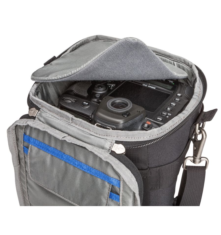 - Adecuada para cámaras DSLR profesionales con 2,8/70-200 mm acoplado, con cierre desplegable y con parasol para objetivo acoplado adicionalmente