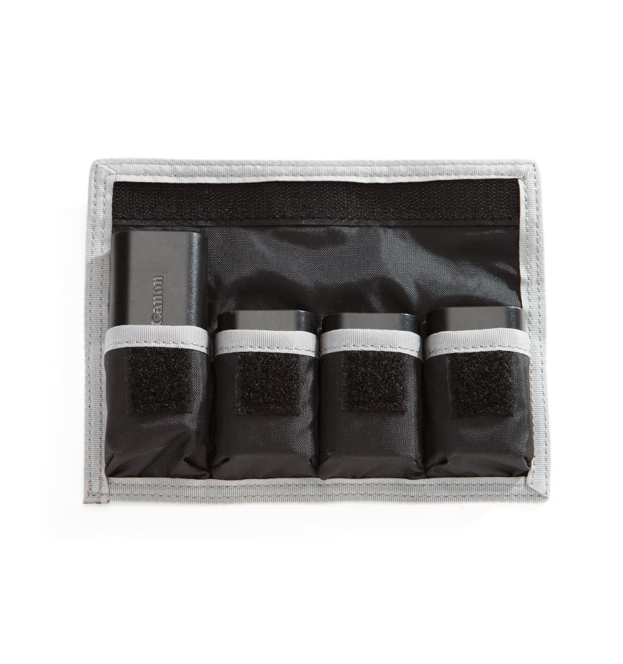 ¡Nada funciona sin una fuente de alimentación! El nuevo Portapilas DSLR 4 se ha desarrollado para que las pilas que necesita estén siempre a mano y no se pierdan en su bolso. Las fundas portapilas plegables, delgadas y planas, tienen capacidad para cuatro pilas estándar de cámaras DSLR. Las pilas se fijan en la bolsa con una correa de velcro.