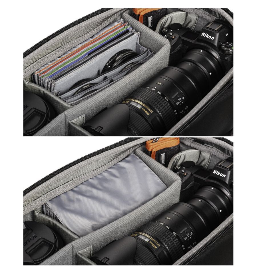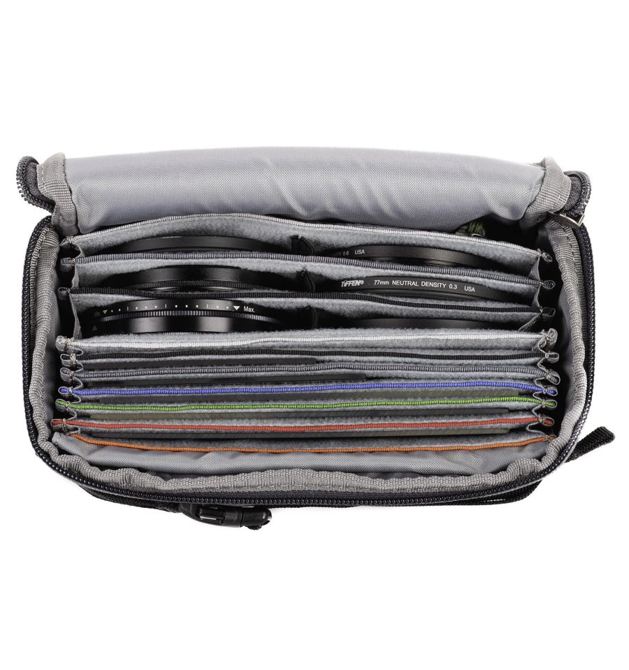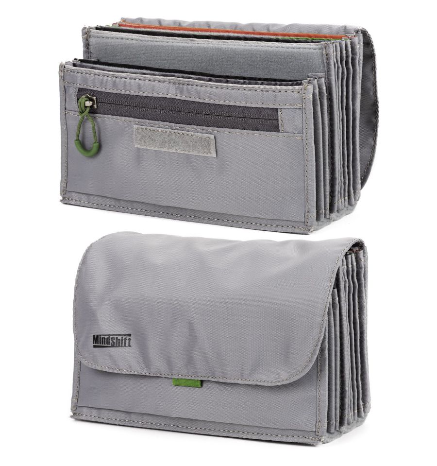 El Filter Hive organiza los filtros y accesorios en un único conjunto. Se puede utilizar en una gran variedad de bolsas o mochilas para cámaras, acoplarse al cinturón o al soporte modular de las mochilas MindShift Gear, o colgarse de un trípode. La bolsa de filtro extraíble admite hasta seis filtros deslizables de 100x150 mm y seis filtros enroscables de hasta 82 mm de diámetro. También apta para filtros Vario-ND de hasta 1,5 cm de grosor. Codificada por colores para una rápida orientación.