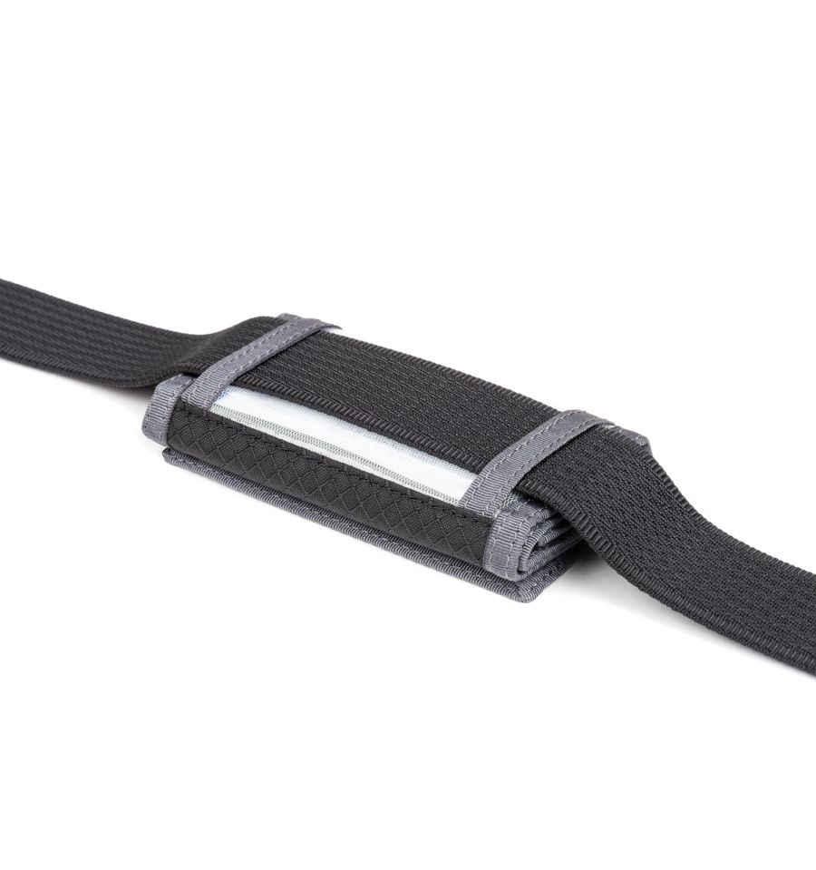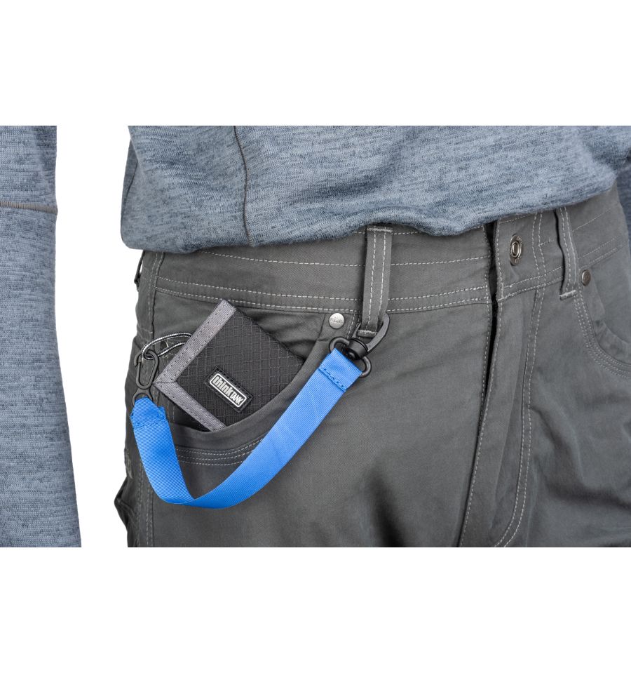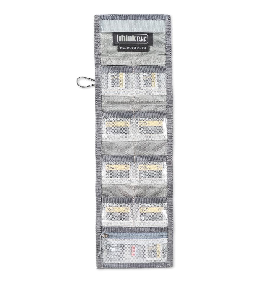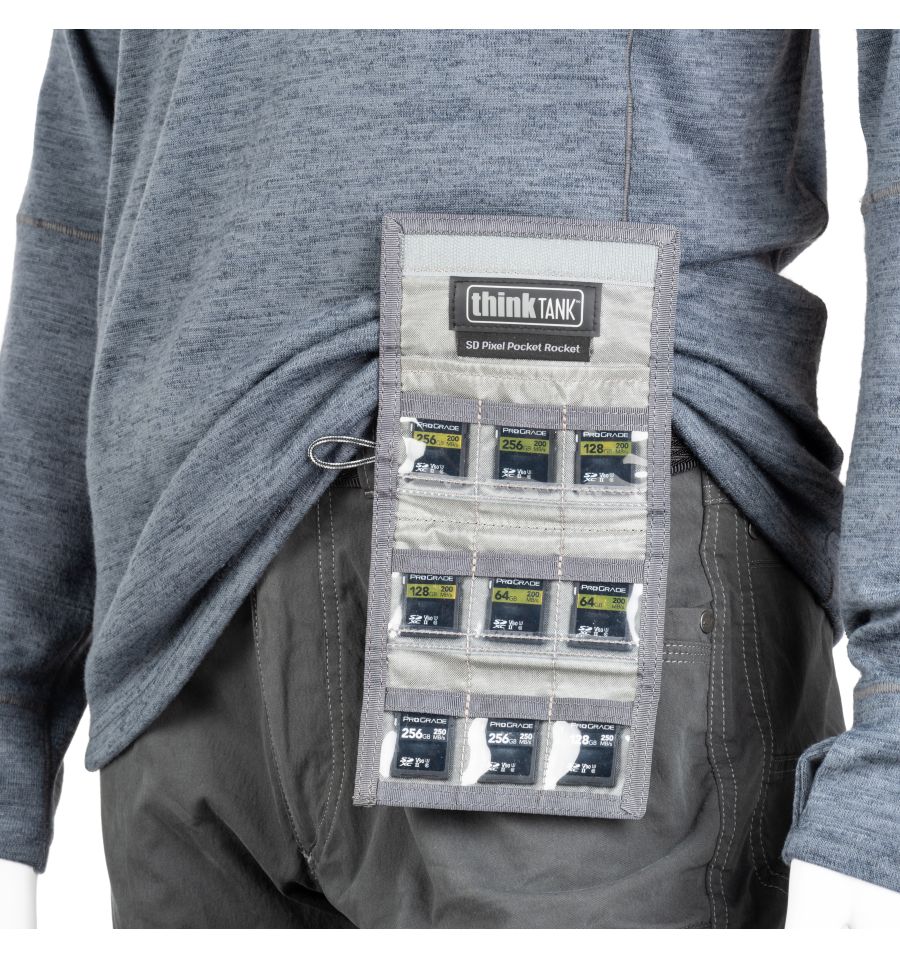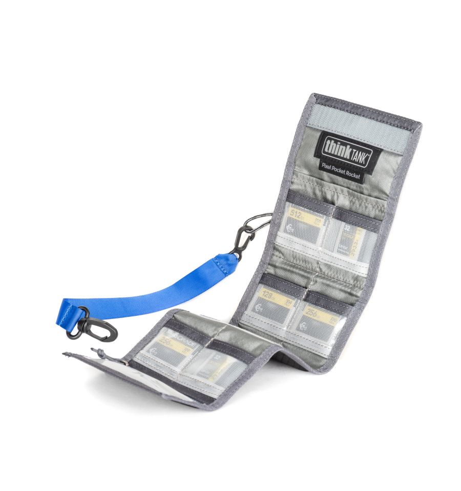 La seguridad está garantizada por la correa de seguridad con dos mosquetones que se incluye, que se puede utilizar para sujetar la Pixel Pocket Rocket a maletines de fotos o maletines, mochilas o prendas de vestir. También se puede sujetar a un cinturón. El PPR, plegable y extremadamente plano, dispone de un compartimento para tarjetas de visita para una rápida identificación y un cierre de velcro extremadamente resistente.