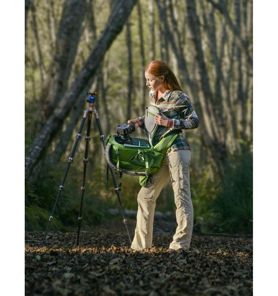 - El uso del MindShift Gear Tripod Suspension Kit (accesorio) permite transportar un trípode en posición de trabajo.