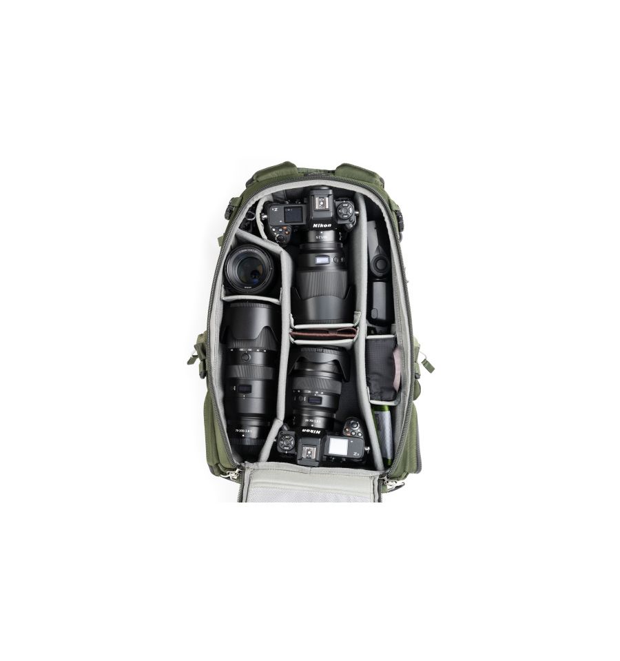 Acceso posterior: Permite trabajar con su equipo de cámara sin quitarse la mochila, evitando ensuciar, mojar, embarrar o congelar el arnés.