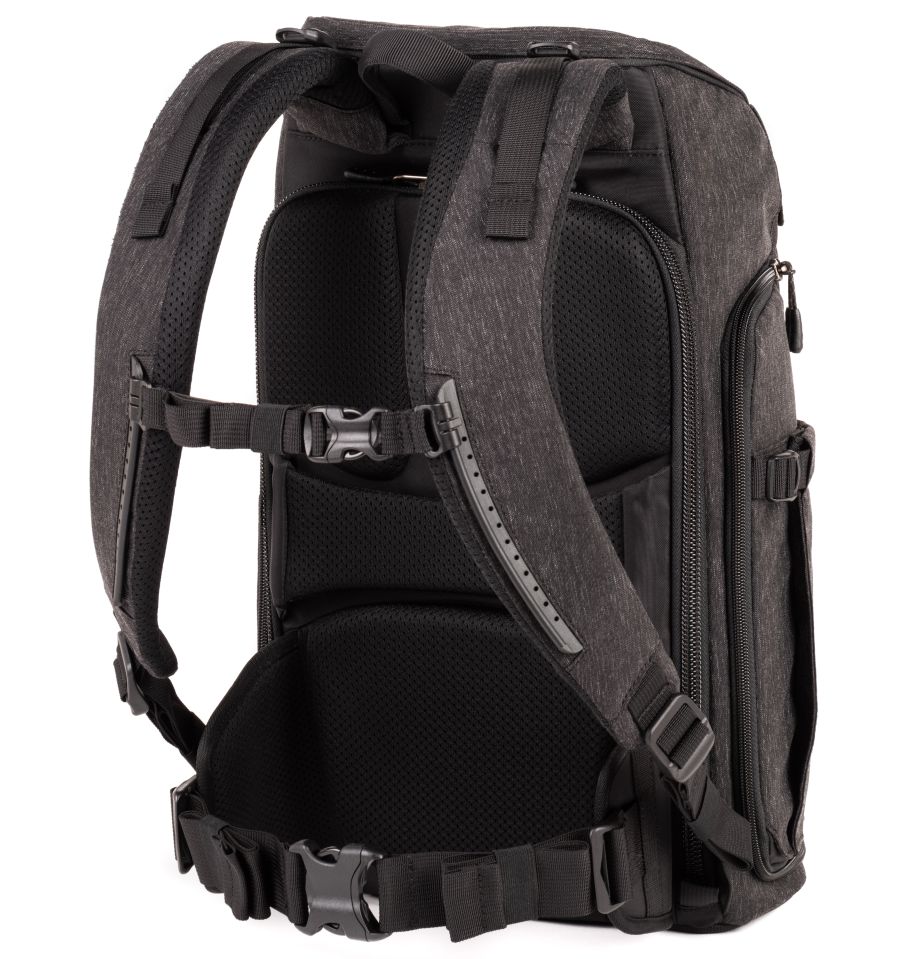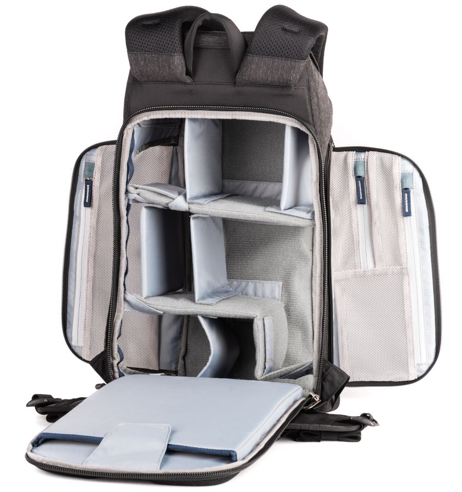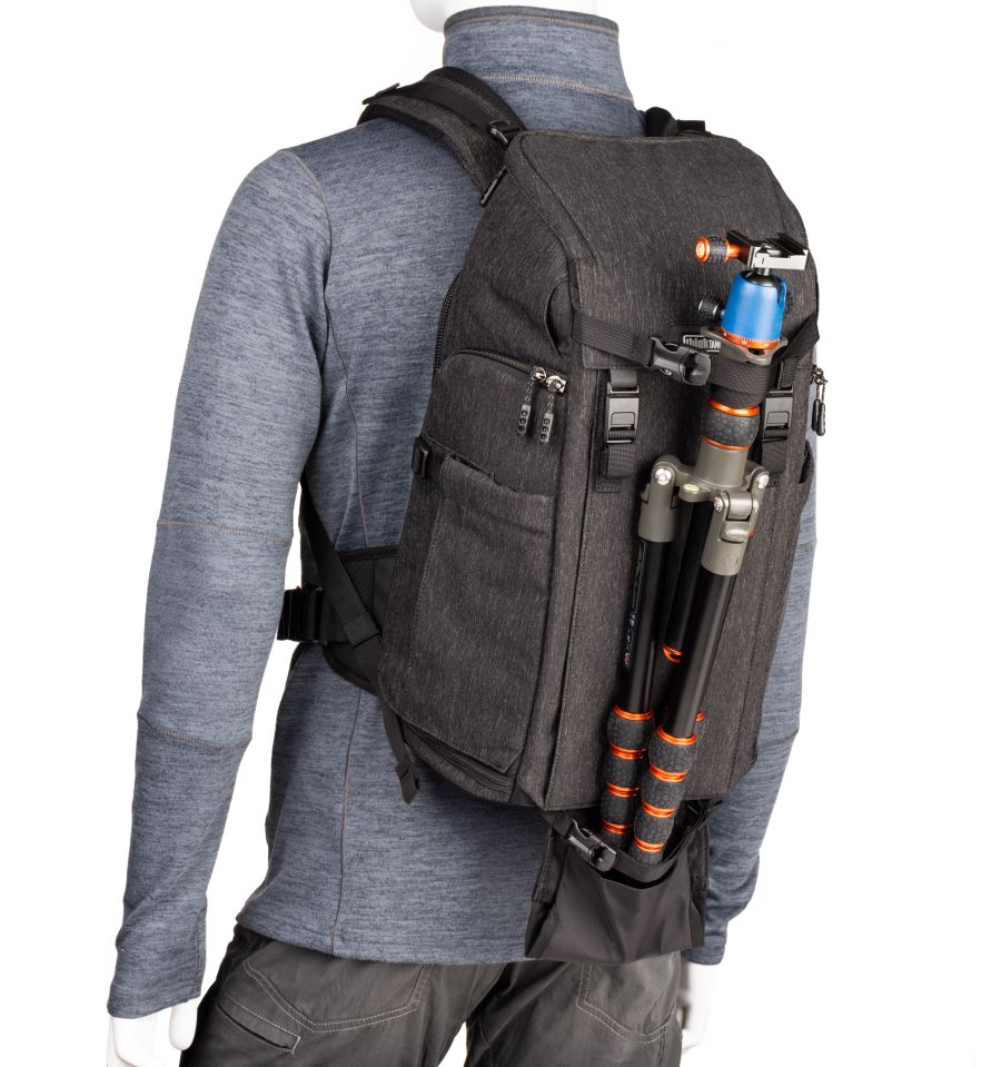 El sistema divisor del interior de las mochilas se puede ajustar para que se pueda acceder al equipo directamente desde el lado derecho o izquierdo, según las preferencias del fotógrafo. Para una protección y seguridad óptimas, el compartimento acolchado para el portátil está situado en la tapa trasera. El compartimento de la parte superior de la mochila cuenta con bolsillos de malla para guardar accesorios como filtros, tarjetas de memoria, baterías y objetos personales. Los bolsillos comprimibles para botellas de agua a ambos lados de la mochila y las correas plegables para trípodes proporcionan un aspecto aerodinámico sin florituras.
