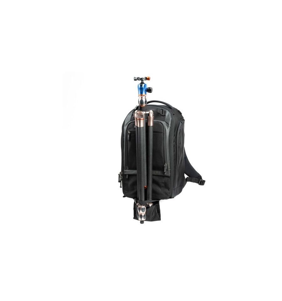 • Tres opciones de transporte de trípode que incluyen dos bolsillos laterales y un bolsillo frontal con copa de caída