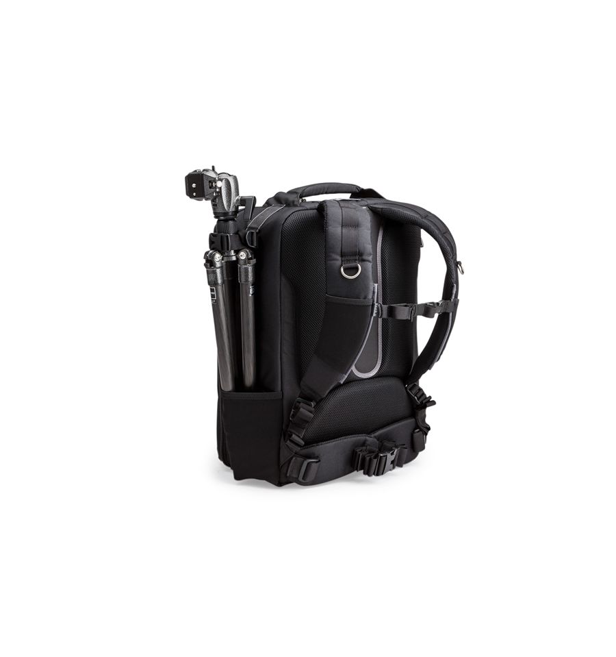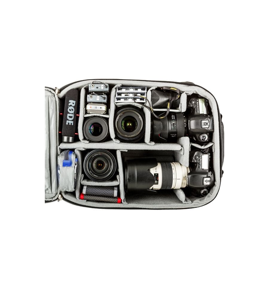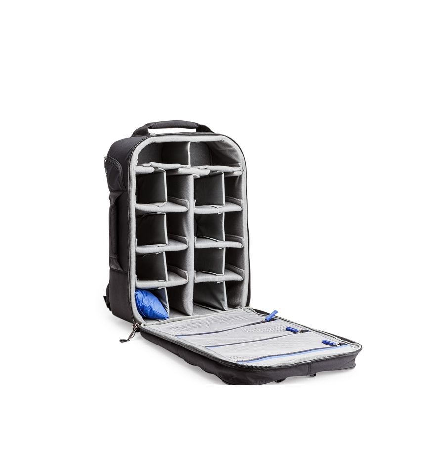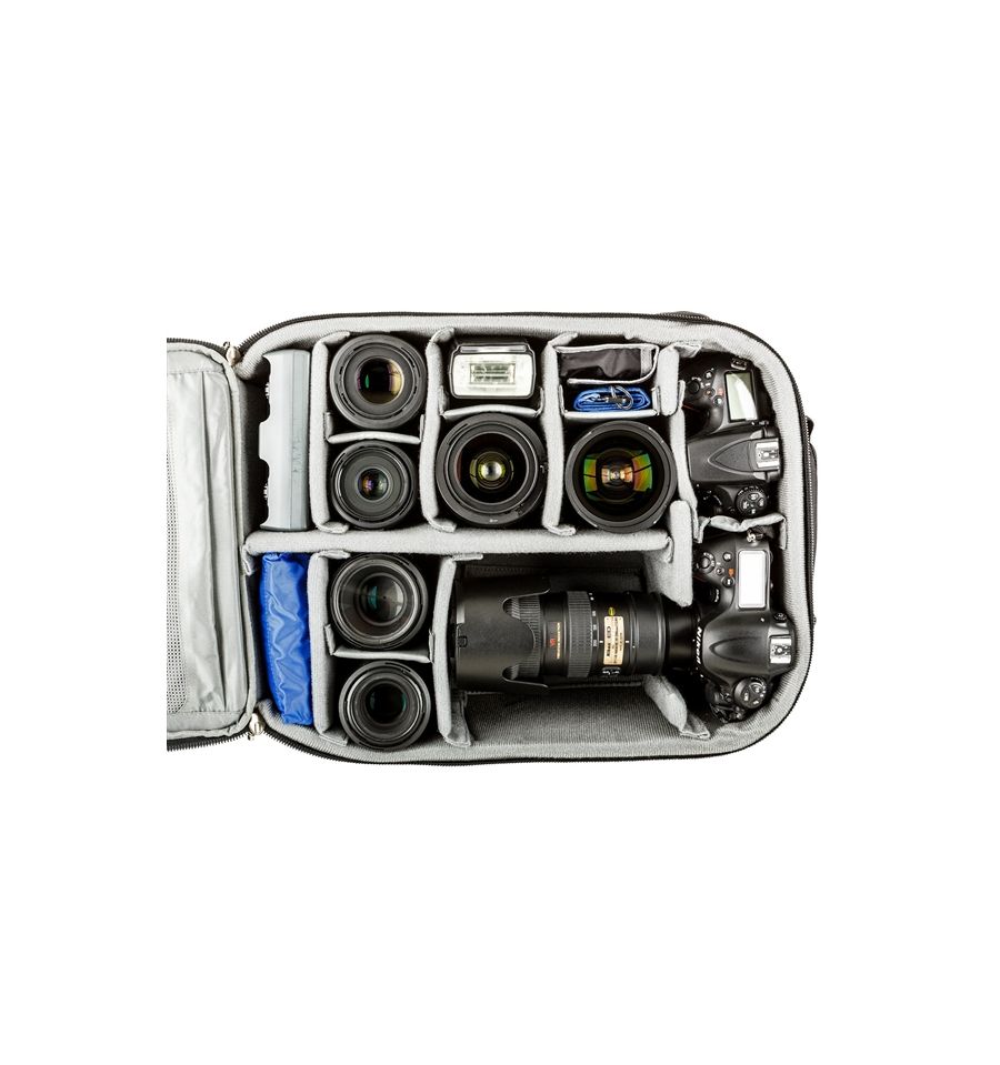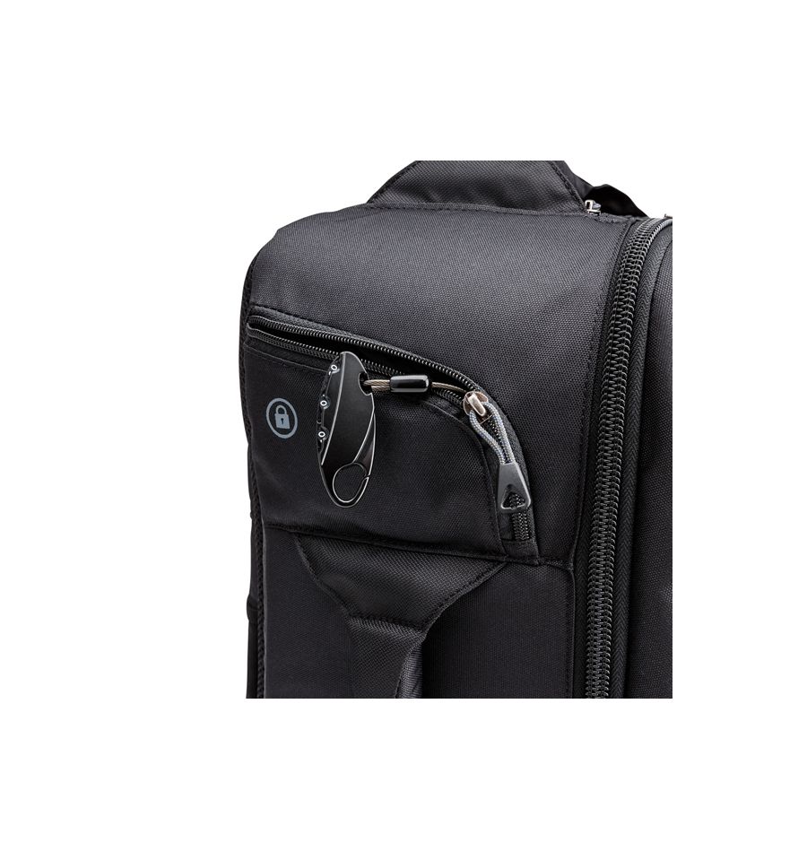 La espaciosa mochila, con espacio suficiente para equipos fotográficos de tamaño mediano a grande, cuenta con dos compartimentos acolchados para el portátil y la tableta con espacio adicional para documentos A4, un bolsillo para la tarjeta de embarque y tres asas que facilitan su almacenamiento en el compartimento superior.