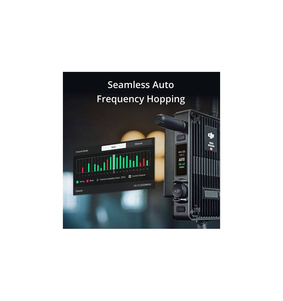 - DJI Transmission admite el salto de frecuencia automático de triple banda, que escanea automáticamente el entorno electromagnético en busca del mejor canal inalámbrico.