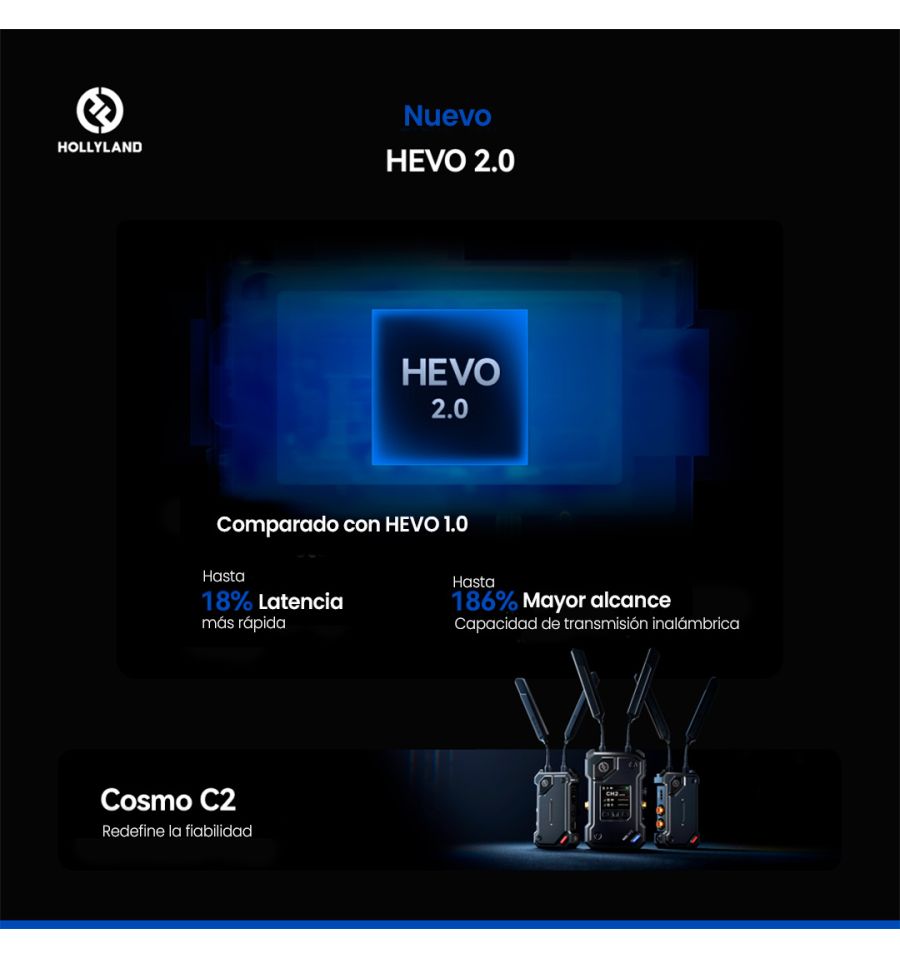 Equipado con la tecnología HEVO2.0 patentada el Cosmo C2 aborda de manera efectiva problemas comunes en la transmisión en vivo, como fallos en la pantalla o tartamudeo debido a interferencias ambientales Su sistema inteligente detecta y cambia automáticamente a canales de frecuencia sin interferencias, garantizando una transmisión estable y sin interrupciones.