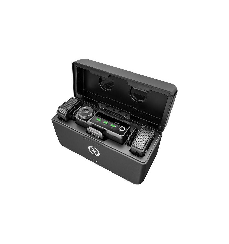 - 2 emisores + 1 receptor + 2 micrófonos lavalier + caja de carga
