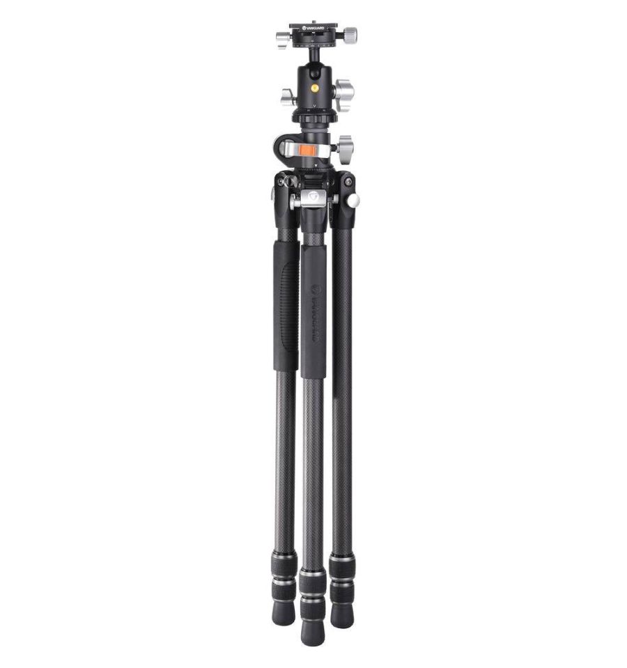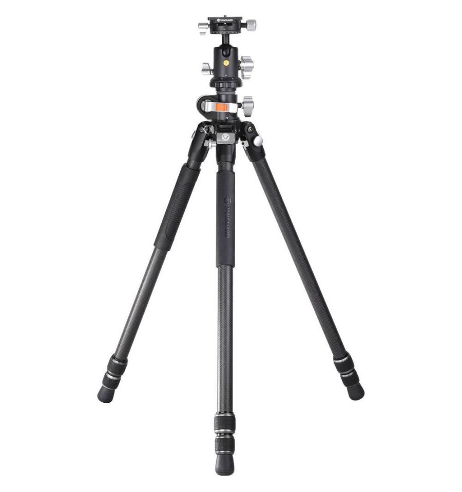 El trípode soporta hasta 33 libras y se ajusta a una altura máxima de 68" cuando la columna central está levantada, o de 58" con la columna bajada. Las patas del trípode se abren en tres ángulos de patas, 23, 50 y 80°, con el más bajo posicionando el trípode a solo 5" sobre el suelo para tomas de ángulo extremadamente bajo y captura de lapso de tiempo. La altura plegada es de 30.5".