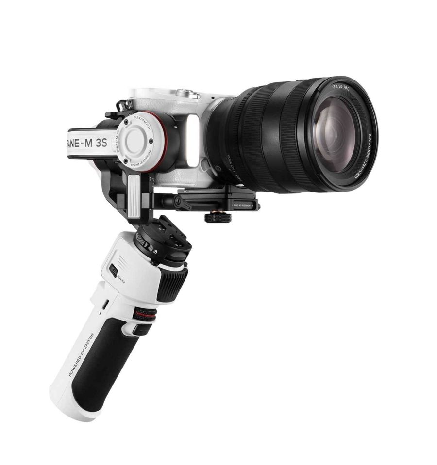 - El gimbal más polivalente de Zhiyun, capaz de estabilizar cámaras compactas, de acción y teléfonos móviles o incluso cámaras sin espejo con sensor de formato completo equipadas con ópticas compactas. Es compatible con la mayoría de cámaras del mercado. Para poder usar un teléfono móvil en el Crane M3S es necesario usar el soporte para móviles, incluido en el kit Combo o disponible por separado.