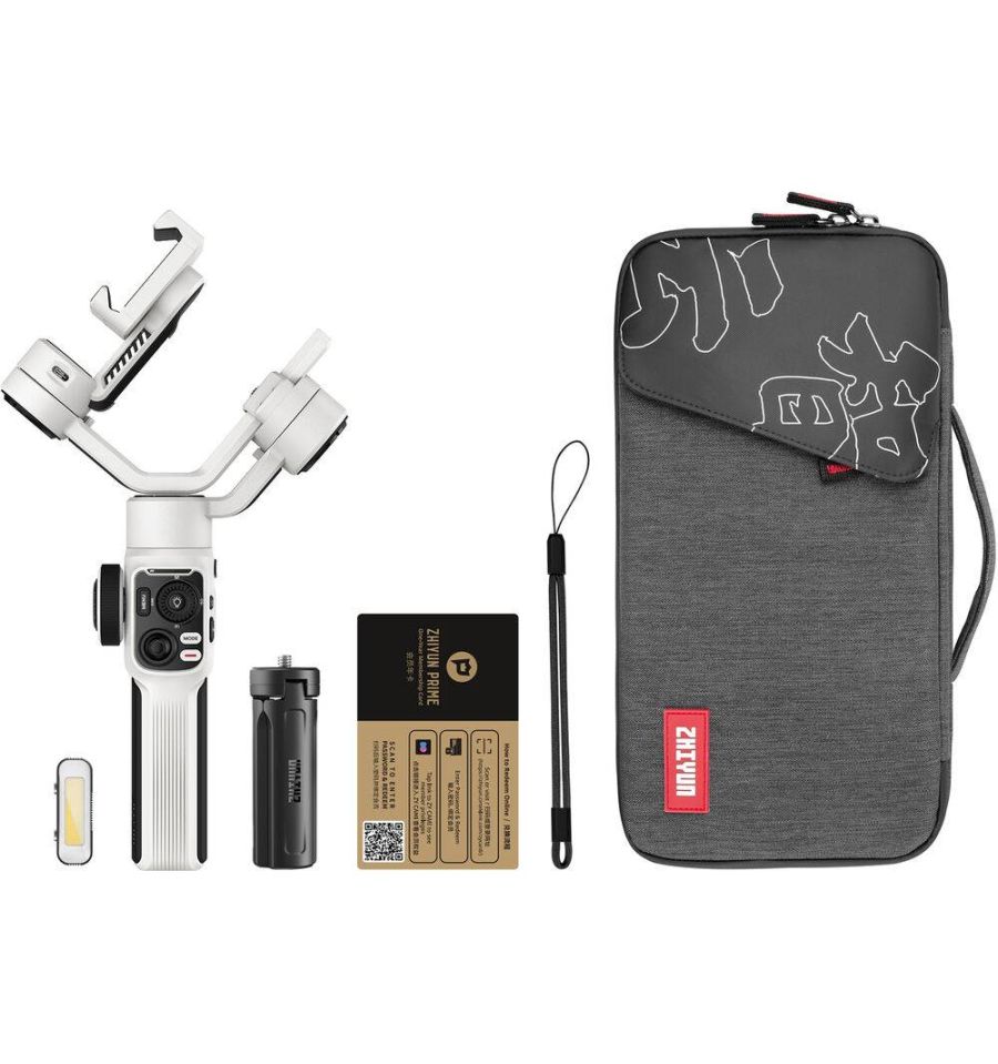 El SMOOTH 5S Pro Smartphone Stabilizer Combo blanco de Zhiyun-Tech combina el cardán del teléfono inteligente con una luz de relleno magnética, una membresía Zhiyun Prime de 1 año, una bolsa de transporte y una correa para la muñeca. SMOOTH 5S se ha actualizado con una potente luz de relleno integrada, motores mejorados, un nuevo algoritmo y una abrazadera más ancha. Con soporte para teléfonos inteligentes más grandes que pesan de 5.3 a 10.6 oz y miden 0.4" de grosor y 2 a 3.5" de ancho, el SMOOTH 5S incluso admitirá combinaciones selectas de lentes externas/smartphone. Un espacio más amplio entre cada uno de los tres ejes le permite crear ángulos cinemáticos más extremos.