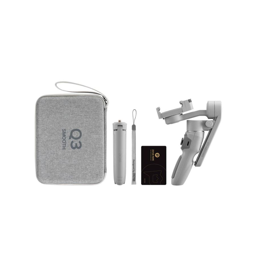 Kit formado por el Smooth Q3 (con el mini trípode), un práctico y elegante estuche de transporte, una correa de mano y una suscripción anual al servicio ZY Prime para disfrutar de más funcionalidades.