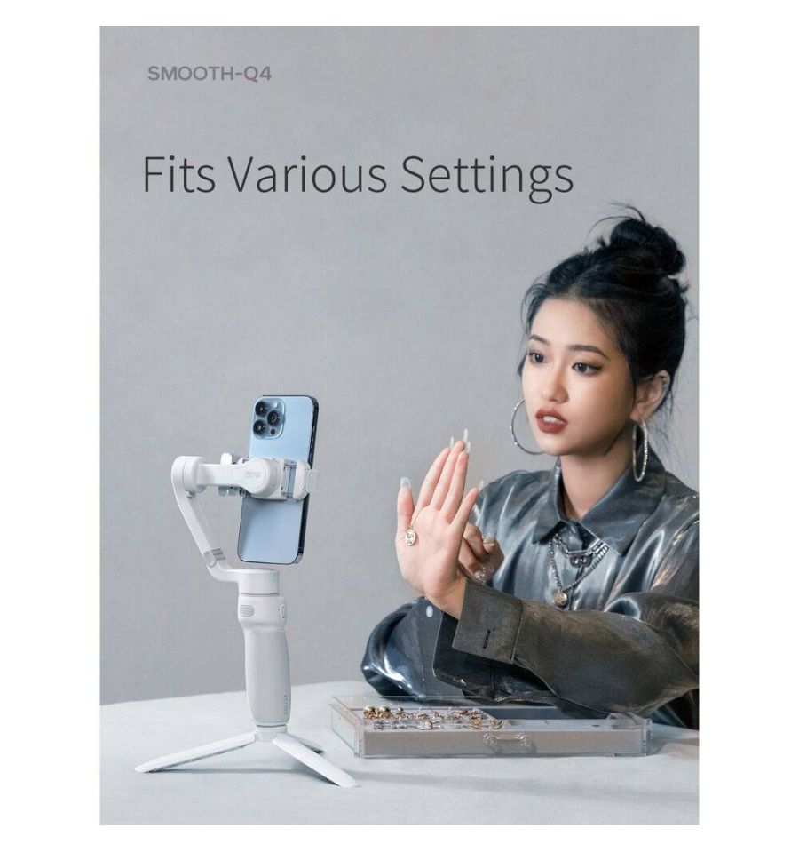 El Smooth-Q4 puede admitir teléfonos inteligentes de hasta 9.9 oz, y su aplicación complementaria para teléfonos inteligentes Android/iOS presenta una gran cantidad de plantillas, herramientas de edición y funciones de control para cumplir con su visión creativa. Cambiar entre los modos horizontal y vertical es tan fácil como presionar un botón, por lo que puede pasar de filmar un paisaje panorámico a filmar un TikTok.